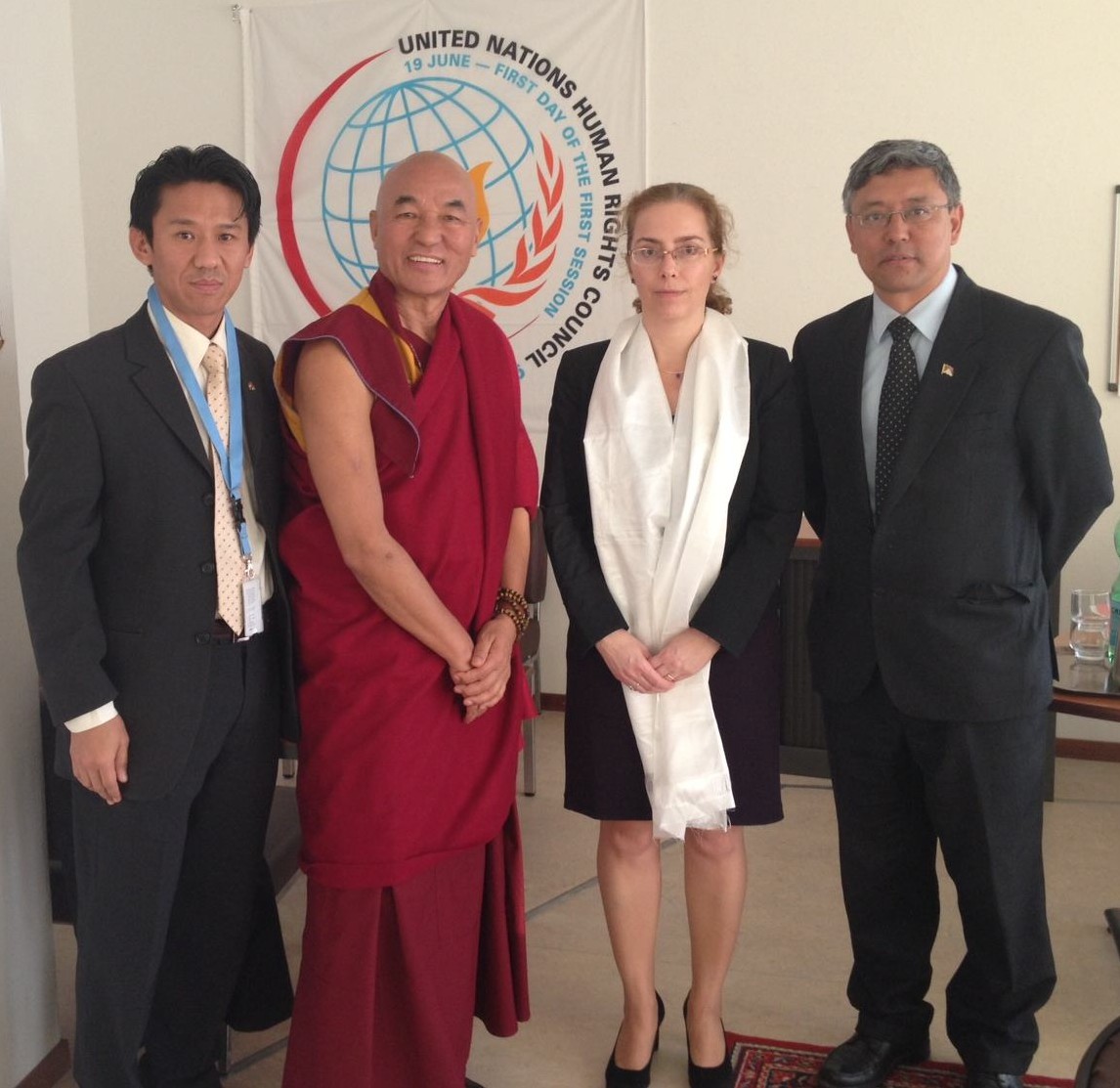 Mr Tenzin S Kayta, of Tibet Bureau; Ven. Thubten Wangchen, Member of Tibetan Parliament-in-Exile; Mrs Laura Dupuy Lasserre, President of the UN Human Rights Council; and Mr Tseten Samdup Chhoekyapa, H.H. the Dalai Lama’s Representative – in Geneva on 10 December