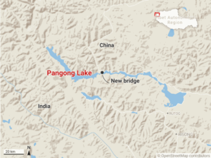 China is building a bridge across Pangong Lake in Ladakh in north India on the border with Tibet. The 500 metre bridge is situated south of an area which, originally in Indian territory, has been occupied by the Chinese since the border war in 1962. The bridge will facilitate access for Chinese troops to the disputed area; India’s response is to boost its defence capabilities in the area.