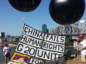 G20 protests have kicked off with Tibetan freedom campaigners from Students for a Free Tibet unveiling huge black balloons and a banner reading "China Fails Human Rights. G20 Unite For Tibet" in Brisbane, Australia, where the G20 summit will be held this weekend. SFT also organised a cycle rally in Delhi, India, to urge the world leaders to stand up for Tibet at the Summit.